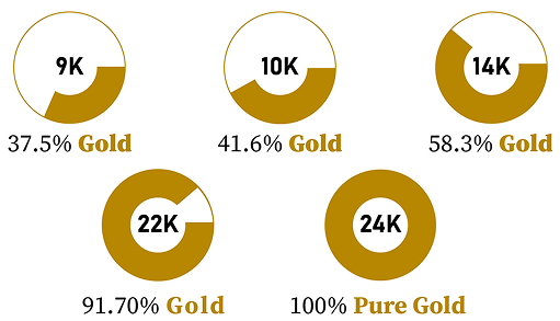 Gold purity is measured in Karats (K), which indicates how much pure gold is